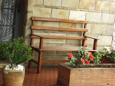 Pedras, floreiras e um banco de madeira.Lustre de flores.